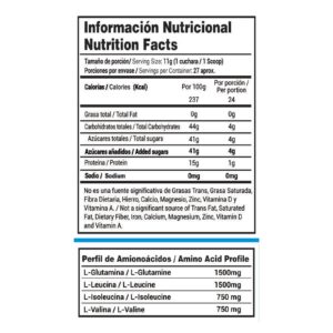 - 26g proteina 168 calorias BCAA Y Glutamina Modo de uso: Agregue 1 scoops en 250ml de agua o leche y mezcle por 30 segundos o hasta que esté completamente disuelto. Consúmase una vez preparado